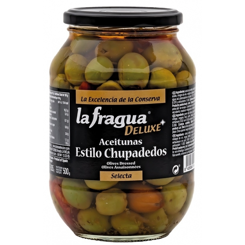 Ingredientes: aceitunas verdes partidas, ajo, pimiento, aceite, vinagre de vino, orégano, albahaca, comino, aromas, agua, sal, potenciadores de sabor: E-621 y E-635, acidulante: E-270 y antioxidante: E-300.