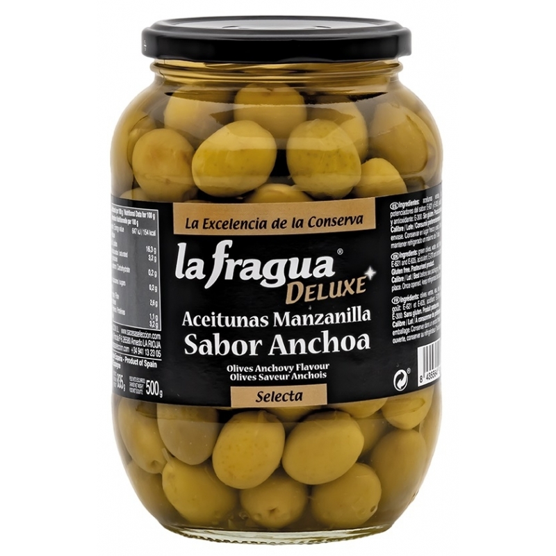 Ingredientes: aceitunas verdes, agua, sal, potenciadores del sabor: E-621 y E-635, acidulantes: E-270 y antioxidante: E-300.
