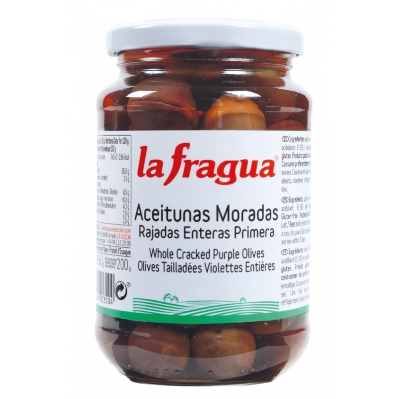 Ingredientes: aceitunas moradas, agua, sal, acidulantes: E-330 y E-270 y antioxidante: E-300.