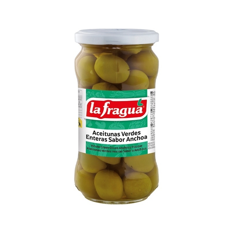 Ingredientes: aceitunas verdes manzanilla, agua, sal, potenciadores de sabor: E-621 y E-635, acidulantes: E-330 y E-270 y antioxidante: E-300.