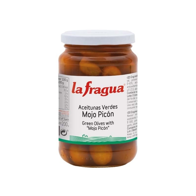 Ingredientes: aceitunas verdes, agua, sal, potenciadores del sabor: E-621 y E-635, acidulantes: E-330 y vinagre, antioxidante: E-300, conservadores: E-202 y E-211, ajos, guindillas troceadas y aromas.