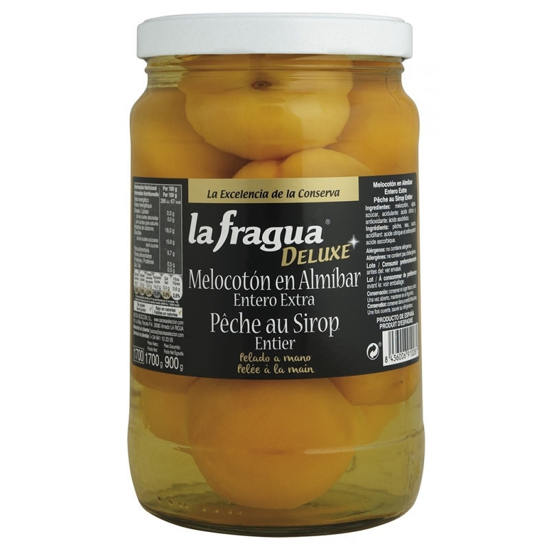 Ingredientes: melocotón, agua, azúcar, antioxidante: E-300 y acidulante: E-330.