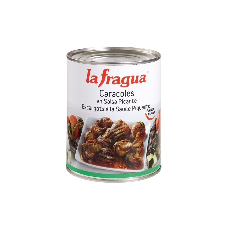 Ingredientes: caracoles (45%), pisto (55%) (tomate, cebolla, berenjena, calabacín, pimiento verde y rojo, aceite de girasol, cayena, azúcar y espesante: almidón de maíz) y sal.