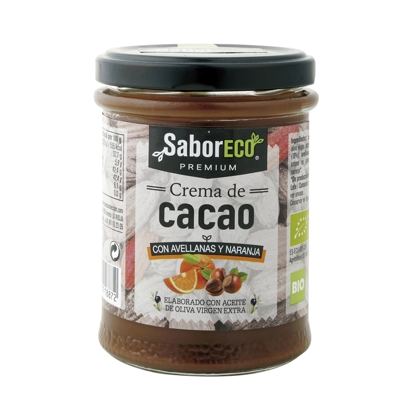 Ingredientes: azúcar de caña*, aceite de oliva virgen extra* (25%), cacao* (18%), avellanas frescas (14%)*, leche entera en polvo* (3%) y aceite esencia de naranja*. *De producción ecológica.