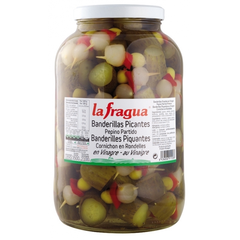 Ingredientes: pepino troceado, cebolla entera, aceituna verde deshuesada, pimiento rojo troceado, guindilla troceada, agua, vinagre de alcohol, sal, antioxidante: E-300 y conservante: E-211.