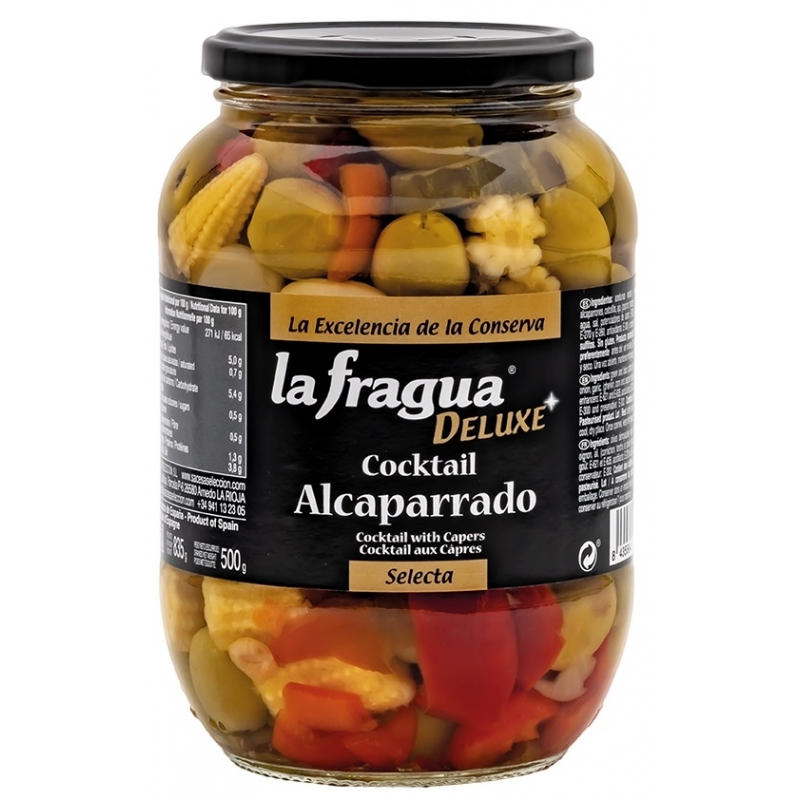 Ingredientes: aceitunas verdes y negras deshuesadas, alcaparrones, cebollita, ajo, (pepino, mazorca y pimiento troceados), agua, sal, potenciadores de sabor: E-621 y E-635, acidulantes: E-270 y E-260, antioxidante: E-300 y conservante: E-202.