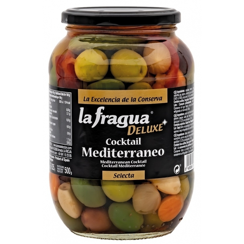 Ingredientes: aceitunas verdes y negras, zanahoria, cebollita, ajo, pepino, pimiento, agua, sal, potenciadores de sabor: E-621 y E-635, acidulante: E-270 y antioxidante: E-300.