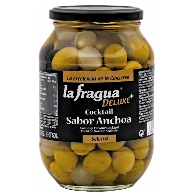 Ingredientes: aceitunas verdes y negras, pepinillo, cebollita, agua, sal, potenciadores de sabor: E-621 y E-635, acidulante: E-270 y antioxidante: E-300.