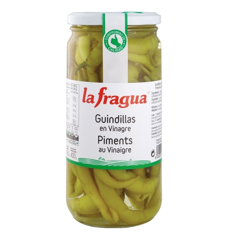 Ingredientes: guindillas, agua, sal, vinagre de alcohol, antioxidante: E-300 y conservante: E-211.