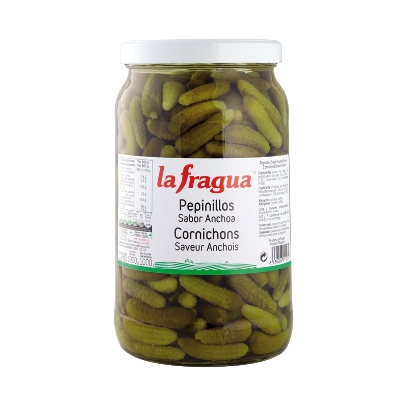 Ingredientes: pepinos, agua, sal, potenciadores del sabor: E-621 y E-635, antiaglomerante: E-535, conservadores: E-202, E-211, E-223, E-270, antioxidante: E-300 y acidulante: E-330.