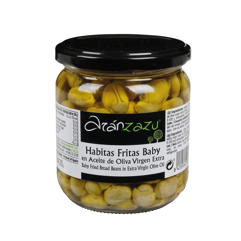 Ingredientes: habitas (70%), aceite de oliva virgen extra (29%), sal, acidulante: E-330 y antioxidante: E-385.