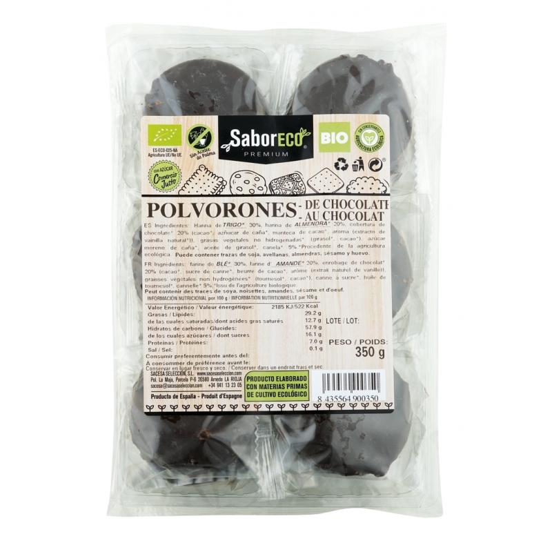 • Ingredientes: harina de TRIGO*, harina de ALMENDRA*, cobertura de chocolate*(20%) (cacao*, azúcar de caña*, manteca de cacao* y aroma (extracto de vainilla natural)), grasas vegetales no higrogenadas* (girasol*, cacao*), azúcar moreno de caña*, aceite de girasol* y canela* (5%). * Procedente de agricultura ecológica.