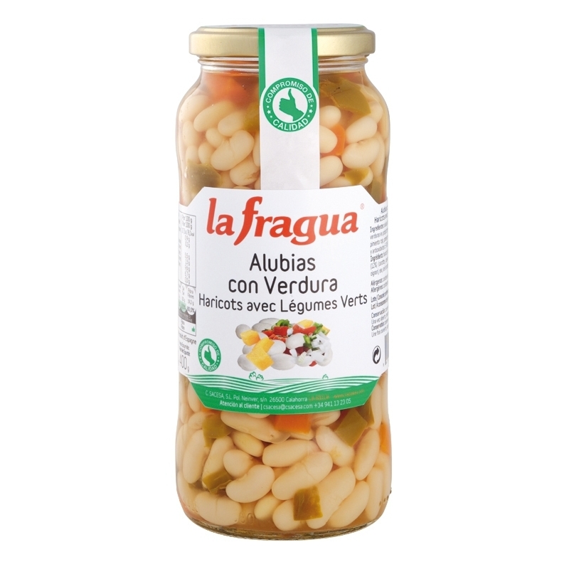 Ingredientes: alubias blancas, agua, hortalizas en proporción variable (10%) (pimiento verde, zanahoria, pimiento rojo y cebolla), sal, secuestrante: E-385 y antioxidante: E-223 (sulfitos).