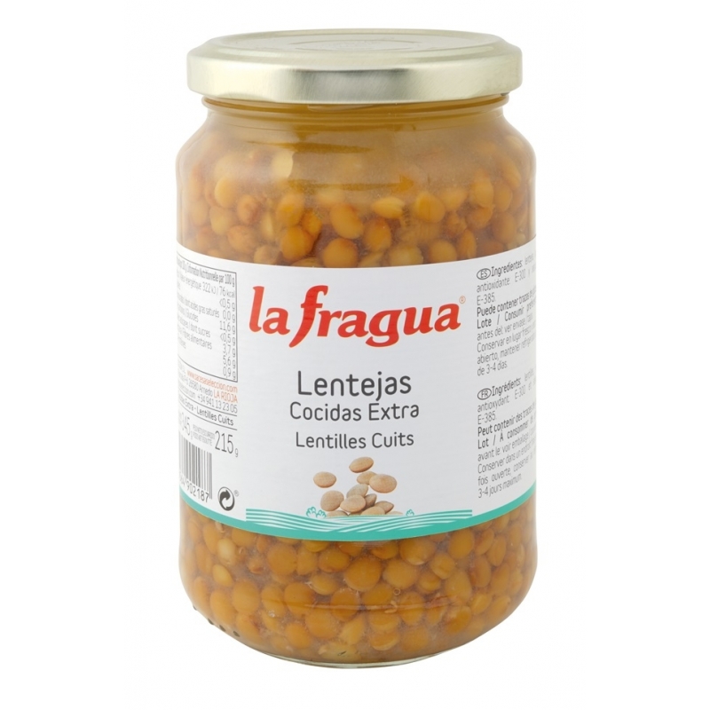 Ingredientes: lentejas, agua, sal, antioxidante: E-300 y secuestrante: E-385.