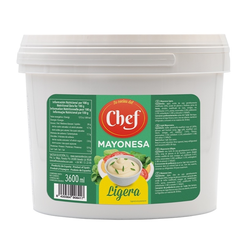 Ingredientes: agua, aceites vegetales (aceite de soja modificado genéticamente y aceite de girasol) (30%), estabilizante: E-1422, jarabe de glucosa y fructosa, yema de HUEVO (5%), vinagre de vino, sal, aroma, acidulante: E-330, conservador: E-202, antioxidante: E-385 y colorante: E-160a(i).