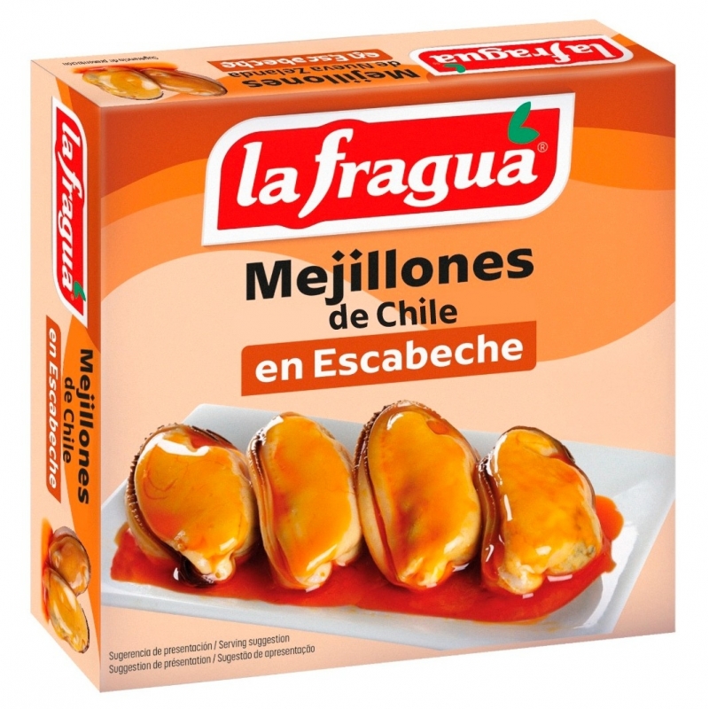 Ingredientes: mejillones de Chile (Mytilus chilensis) y escabeche (aceite de girasol, vinagre de vino, agua, aromas naturales y sal).