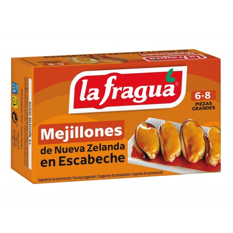 Ingredientes: mejillones de Nueva Zelanda (Perna canaliculus), aceite de girasol, vinagre de vino, agua, sal y aromas.