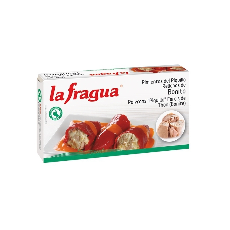 Ingredientes: pimientos del piquillo (4-5) (33%), tomate, leche, bonito (Thunnus alalunga) (10%), cebolla, harina de trigo, aceite de girasol, azúcar, vino blanco, sal, ajo, almidón de maíz modificado, especias y acidulante: E-330. 25% de bonito en la pasta de relleno.