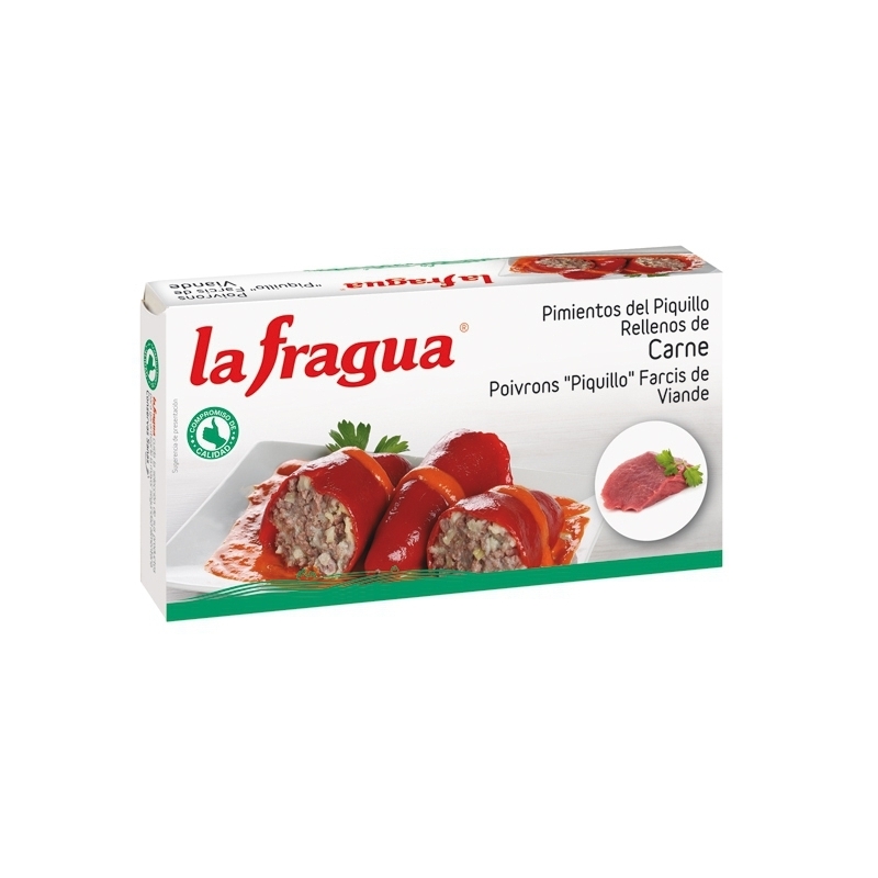 Ingredientes: pimientos del piquillo (4-5) (33%), tomate, leche, cebolla, carne de cerdo (7%), harina de trigo, aceite de girasol, vino blanco, azúcar, sal, ajo, espesante: almidón modificado de maíz, especias y acidulante: E-330. 20% de carne en la pasta de relleno.