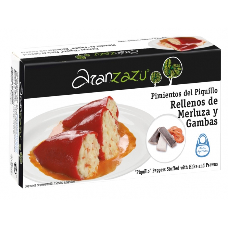 Ingredientes: pimientos del piquillo (4-5) (33%), tomate, leche, cebolla, harina de trigo, aceite de girasol, merluza (9%), gambas (2%), vino blanco, azúcar, sal, ajo, espesante: almidón modificado de maíz, especias y acidulante: E-330. 20% de merluza y 3,5% de gambas en la pasta de relleno.