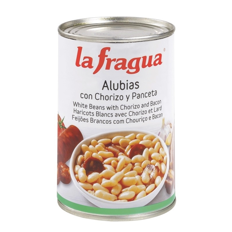 Ingredientes: alubias blancas (50%), agua, panceta salada (4%) (panceta de cerdo, sal, especias, dextrosa, antioxidante: E-301), chorizo (3%) (carne de cerdo, pimentón, sal, ajo, azúcares, proteína de cerdo, fibra vegetal, aroma, especias y envoltura artificial (colágeno)), concentrado de tomate, almidón de maíz modificado, sal y especias.