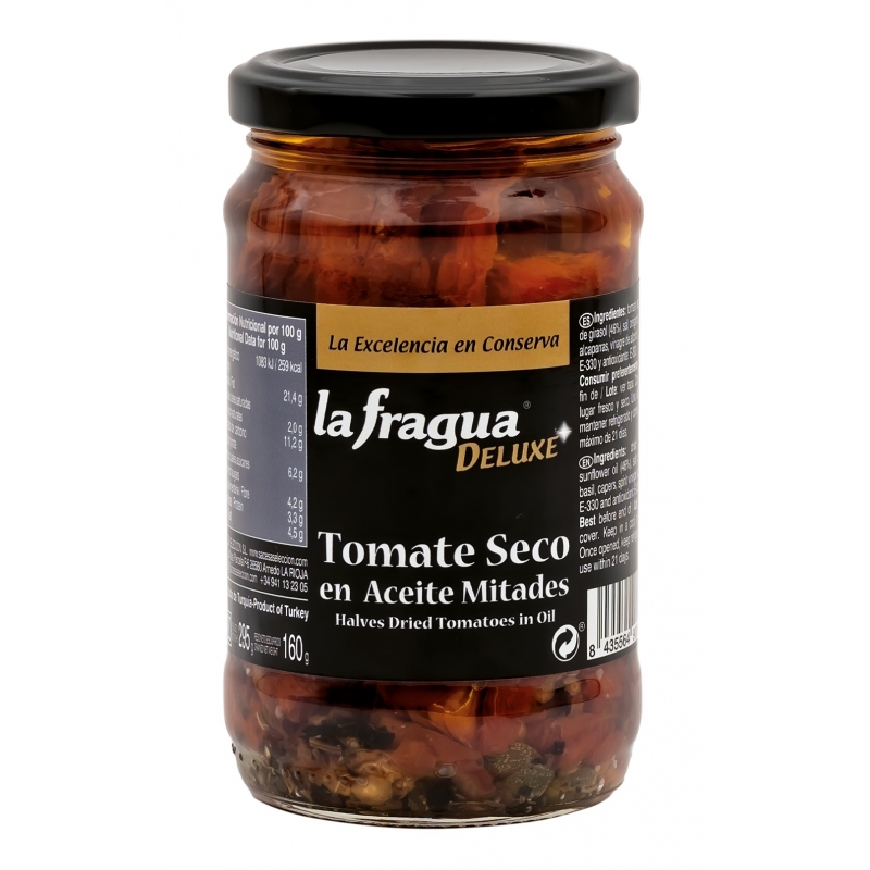 Ingredientes: tomate seco, aceite de girasol (46%), sal, orégano, albahaca, alcaparras, vinagre de alcohol, acidulante: E-330 y antioxidante: E-300.