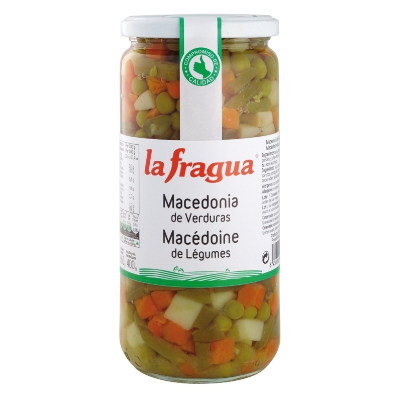 Ingredientes: mezcla de verduras en proporción variable: patata en cubos (15-40%), guisantes (15-40%), zanahoria en cubos (15-40%) y judía verde redonda en trozos (10-30%), agua, sal y antioxidante: E-330.
