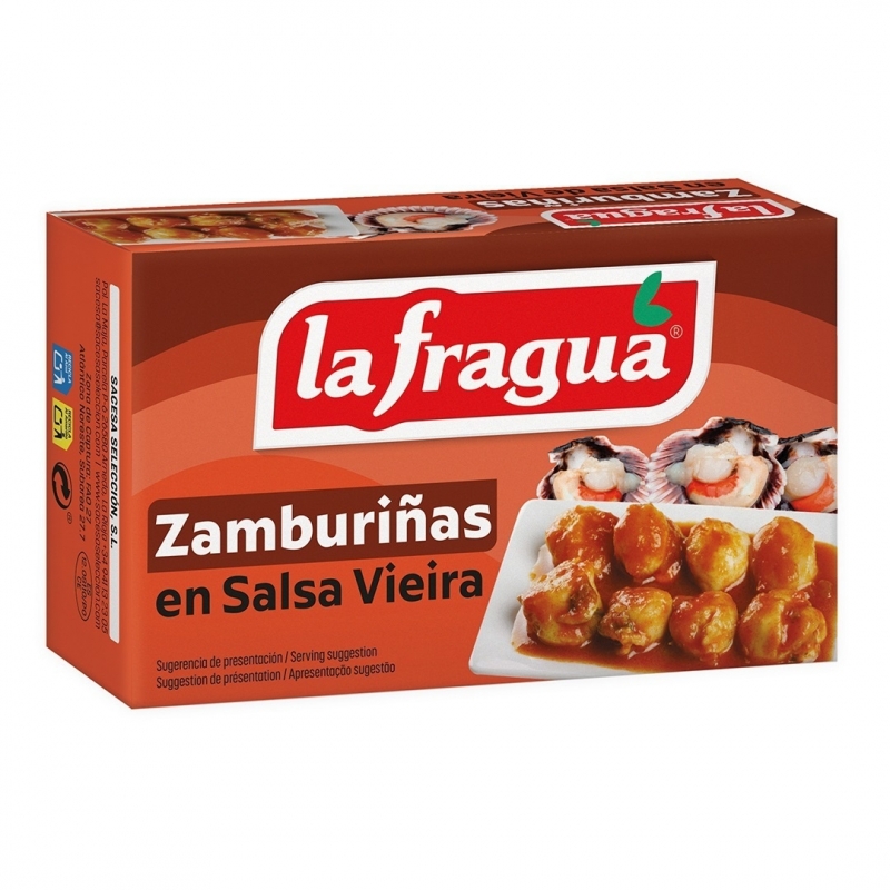 Ingredientes: zamburiñas y salsa de vieira (aceites de girasol, tomate, cebolla, vino blanco, sal y especias).