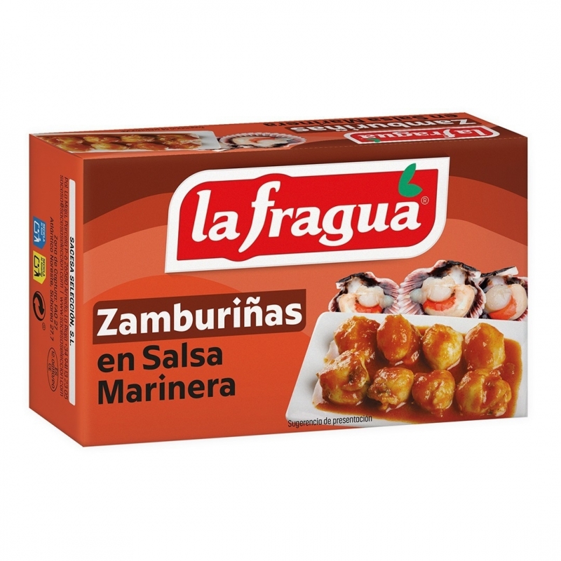 Ingredientes: zamburiñas (Chlamys varia / Arquipectec opercularis) y salsa de vieira (aceite de girasol, agua, cebolla, tomate concentrado, pimentón picante, sal y fécula de patata).